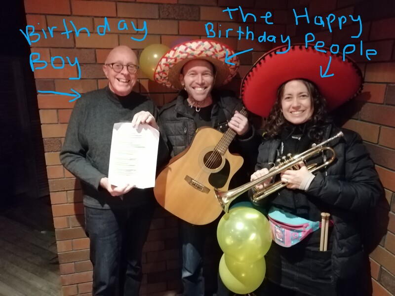 We are a local singing telegram service with a difference - we use instruments! (trumpet, guitar etc) We're based in Auckland, New Zealand and our job is to help you celebrate your special someone on their birthday (or Fathers/Mothers day, Valentines day or whenever)! We turn up to their home, office or location of interest and give them a personalised performance. This includes a couple of variations of Happy Birthday, followed by a rhyme unique to them. We crown the whole thing off with a round of For He's a Jolly Good Fellow and end with party poppers and confetti! If you want a gift idea with a difference, give your friend or loved one a personalised "singing telegram" style performance they won't forget by booking in the Happy Birthday People today!