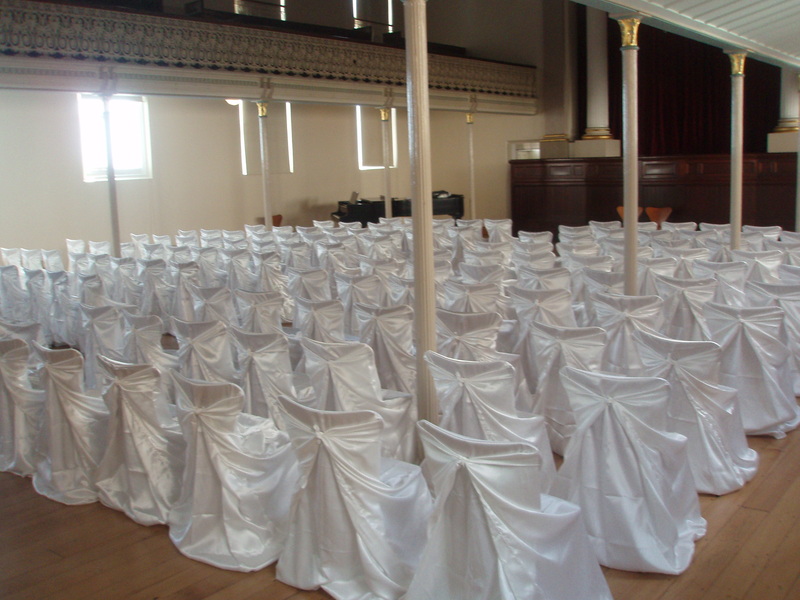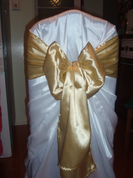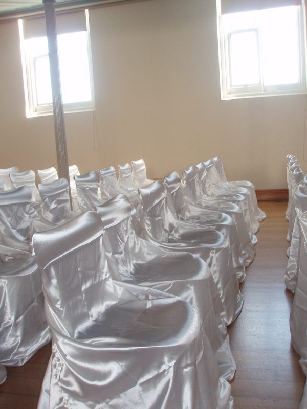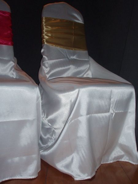Shiny, satin, white, universal chair covers. Quality satin material. Great for all your special functions. These give a draped look at the back of the chairs and fit more compactly to chairs. We prefer to put on covers ourselves for maximum impact as a special technique is required to fit these covers.
