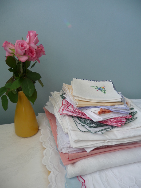 A selection of sweet plain and embroidered tablecloths and table napkins in various sizes and shapes. Tablecloths $5, napkins $1.